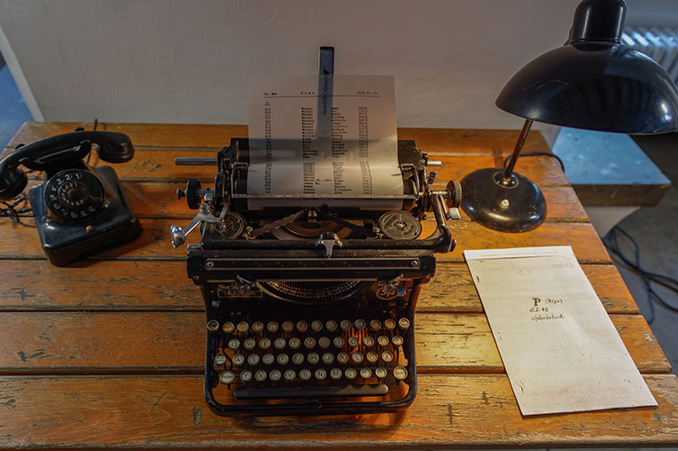 Aus einem originalen Volksempfänger des Typs VE301 tönte die Hitlerrede vom 30. Januar 1939, in der er „die Vernichtung der jüdischen Rasse“ androhte. Neben einer Schreibmaschine Modell D von Seidel & Naumann ein altes Telefon und die Kopie einer Original-Deportationsliste mit 1000 Namen. Auf dem Boden ein Monitor mit Filmfragmenten der Massenmorde Strand von Škede bei Liepaja im Dezember 1941. Dieser Film verweist auf die im Gang versetzt stehenden zwei Säulen mit ihren unzähligen Löchern, aus denen weißes Licht und ein dumpfer Herzschlag dringt.