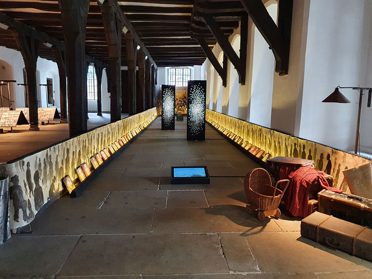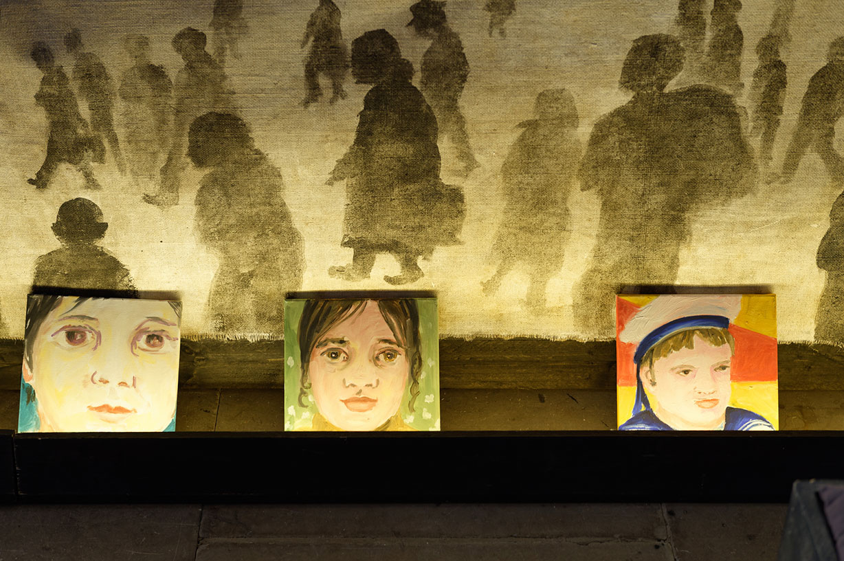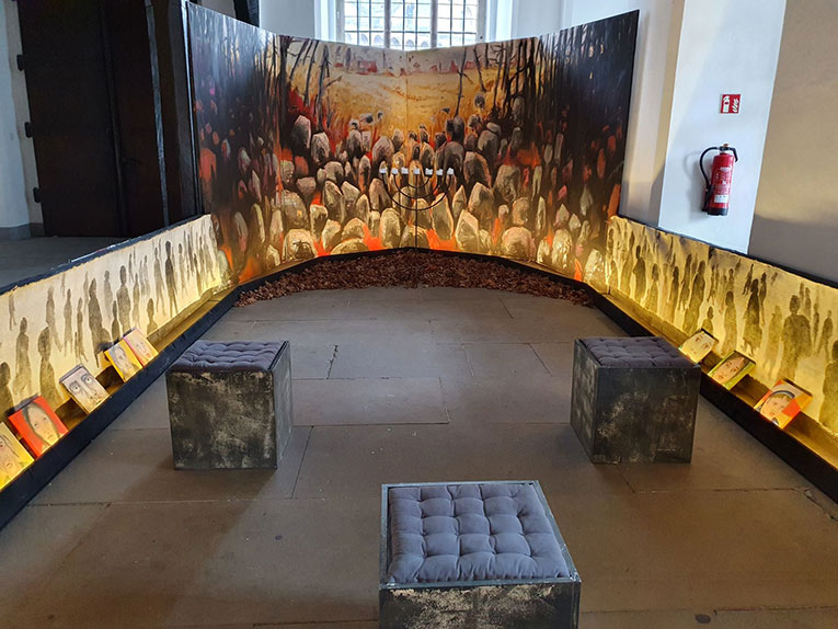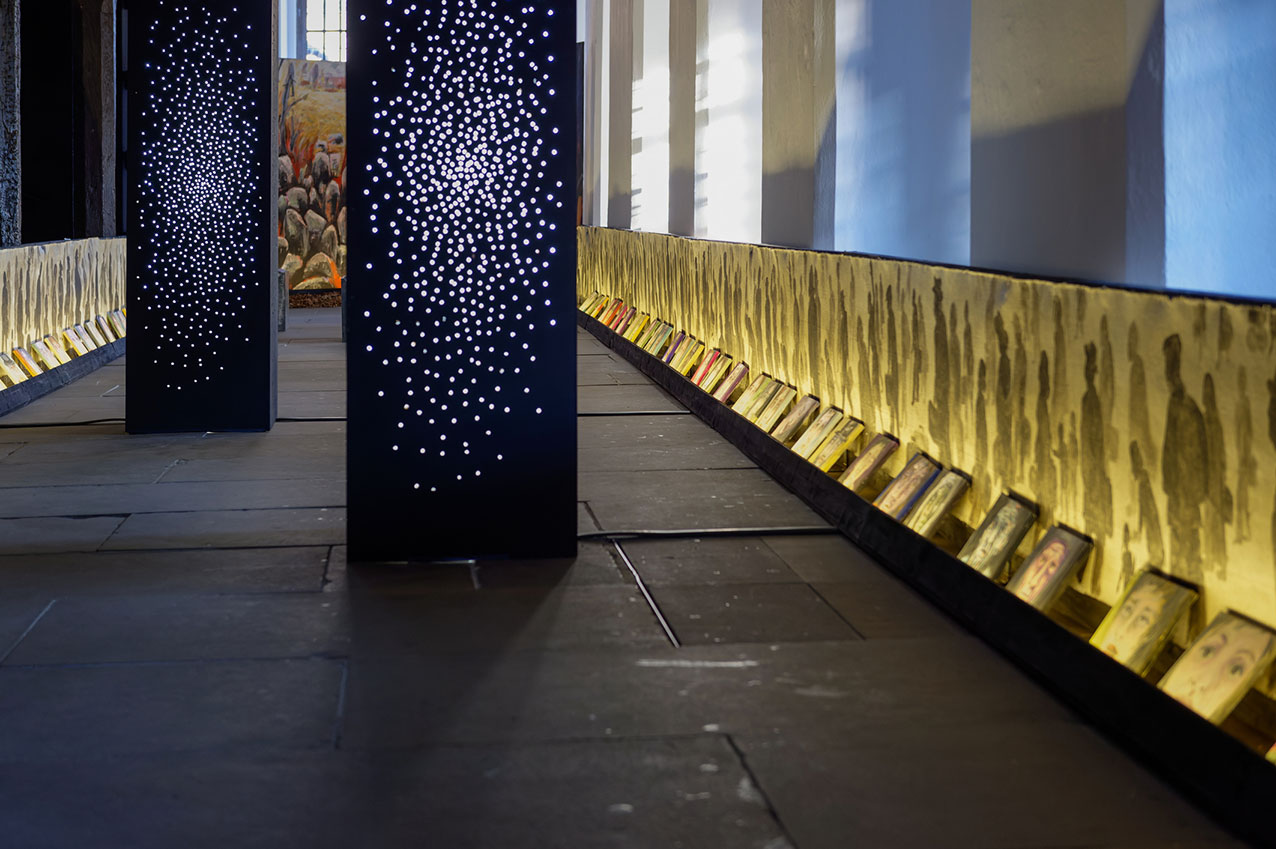 Der lang gestreckte, aber schmale Raum machten es erforderlich, das 7,20m breite Abschlussbild auf 4m zu bringen. Die Lösung fand sich, indem die 4 Bildteile als halbes Achteck aufgestellt nun frei im Raum stand und eine Art Apsis bildete. Von dort bildeten zwei über 20m lange „Menschenzüge“ einen schmalen Gang, der nun den abschließenden Weg zu den Massengräbern im Wald von Rumbula assoziierte.